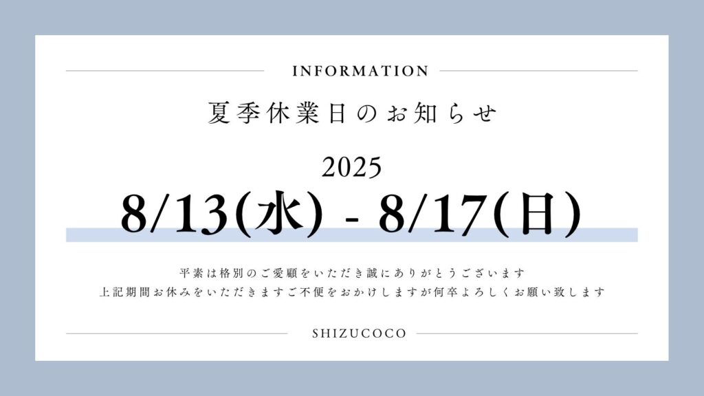 平素は、格別のご高配を賜り厚く御礼申し上げます。夏季休業は下記の通りとなります。 お客様にはご迷惑をお掛けいたしますが、 何卒ご理解下さいますようお願い申し上げます。 2025年8月13日(水)~2025年8月17日(日) お知らせ